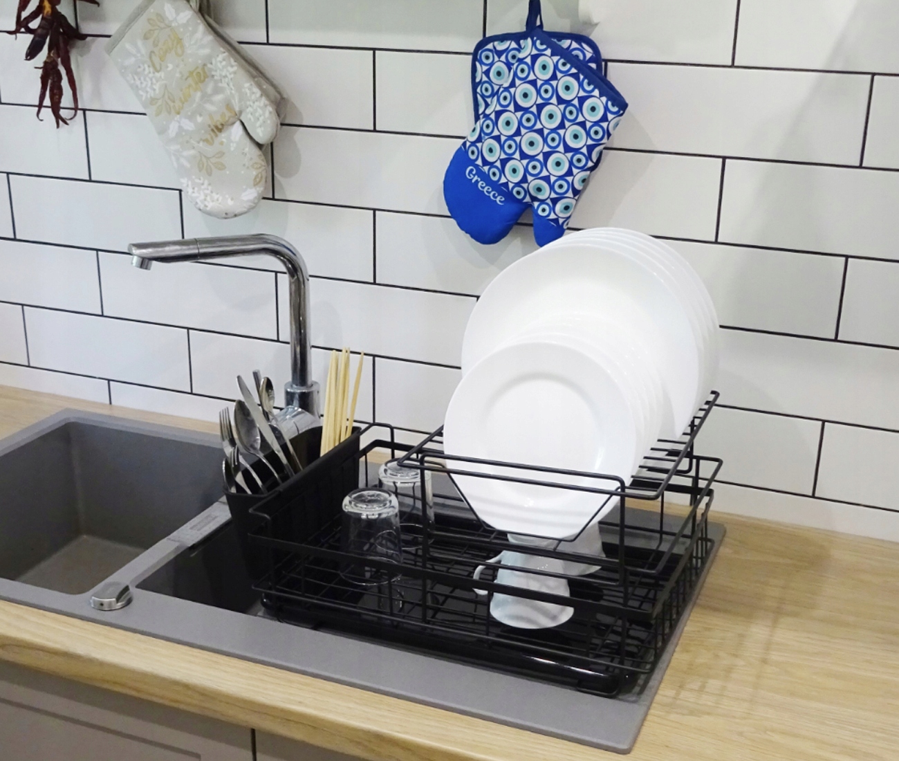 Naczynia szybko wysychają na ociekaczu, a dzięki podkładce gromadzącej wodę, możne go postawić praktycznie w każdym miejscu.