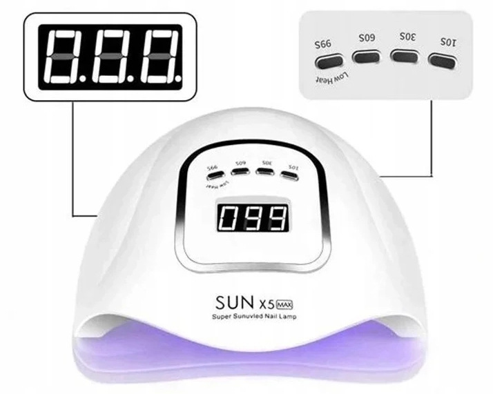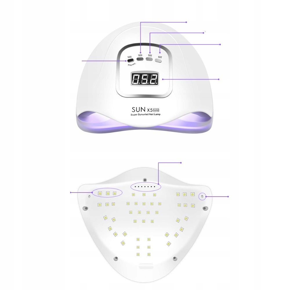- diody rozmieszczone są równomiernie na całej górnej podstawie i po bokach, dzięki czemu dobrze doświetlają całą dłoń prawidłowo utwardzając żel na każdym paznokciu;
